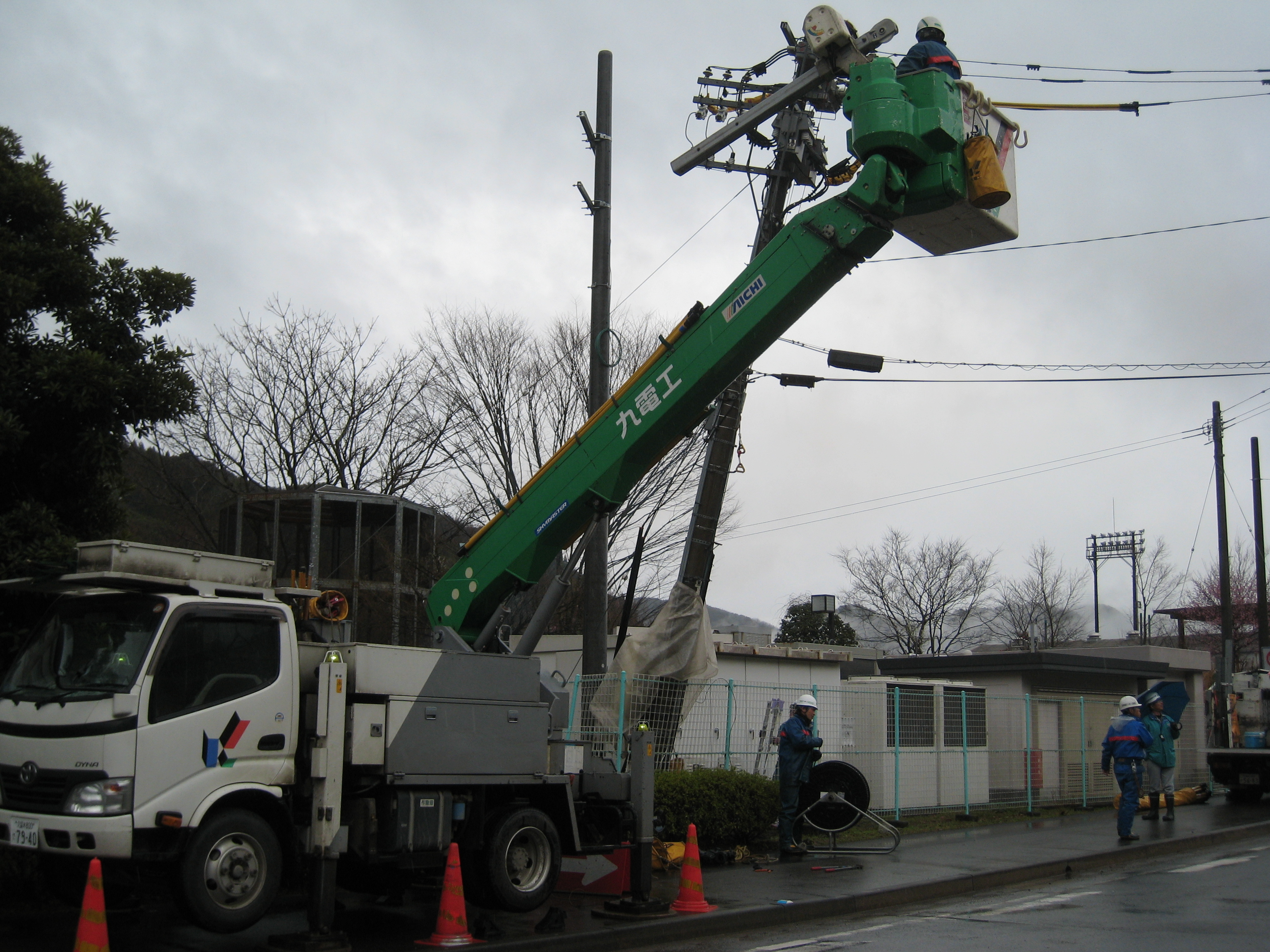 昨年7月の九州北部豪雨災害で、土砂に押されて傾いていた電柱の側に、新しい電柱を立てていただきました。朝10時から夕方5時頃まで施設内を停電としての作業でしたが、非常用発電機により最小限の照明は確保出来ていました。