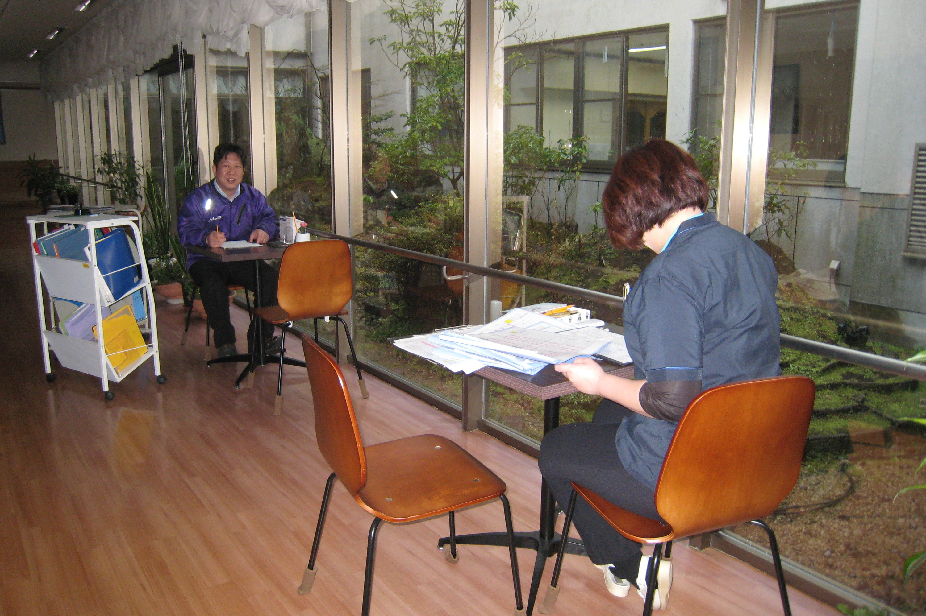 災害以来8ヶ月ぶりの停電でしたが、職員も対応に慣れ、また計画停電ということもあって、事前の備えを以って混乱無く過ごすことが出来ました。事務室内は照明がなく暗いため、私と栄養士は中庭に面した廊下のテーブルで仕事をしました。